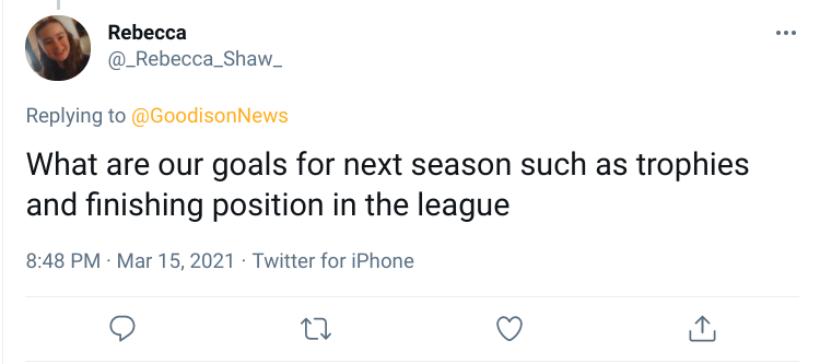 Aside from cup silverware, Everton will turn their attention to furthering their European ambitions. If the Blues qualify for the Europa League this season, the aim next season will be to go as far as possible in that competition while striving to achieve qualification once again through Premier League placement. If the club qualifies for the Champions League, the aim will be progress to the knockouts.