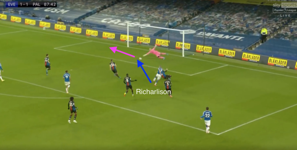 Richarlison collected possession, moved into an opportune position to ease the ball past Palace goalkeeper Vicente Guaita, however his shot had the perfect height and placement for the Spaniard to comfortably claim.