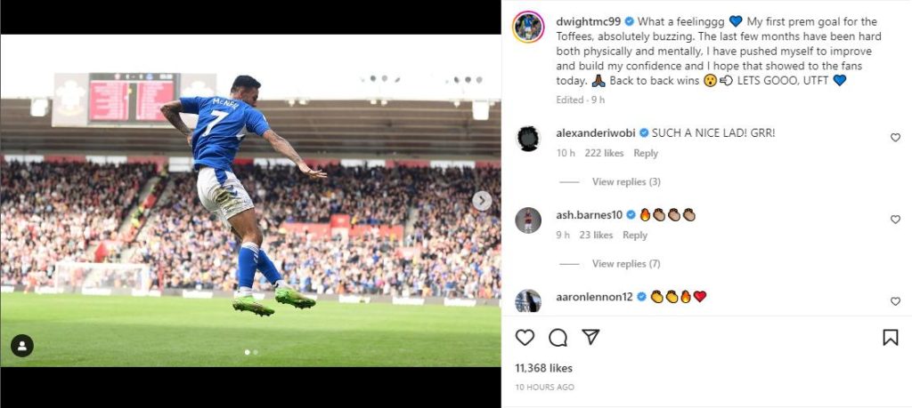 McNeil’s Instagram post read: “What a feeling. My first Prem goal for the Toffees, absolutely buzzing.