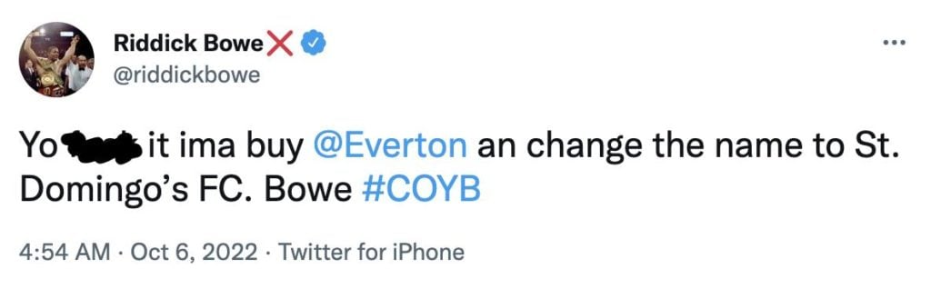 Posting on Twitter on Thursday afternoon (6 October) the former heavyweight champion said: “Yo [expletive] it ima buy Everton an change the name to St. Domingo’s FC. Bowe COYB”.