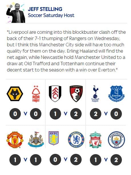 “Liverpool are coming into this blockbuster clash off the back of their 7-1 thumping of Rangers on Wednesday, but I think this Manchester City side will have too much quality for them on the day,” said Stelling on the Super 6 website.