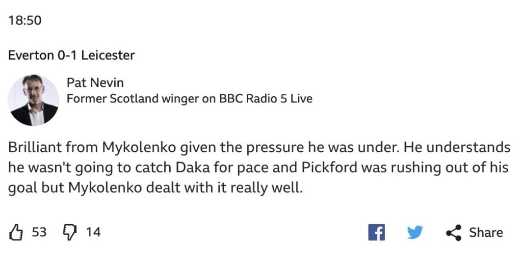 Speaking on BBC Radio 5 Live, as per the BBC Sport live blog of the game Nevin said: “Brilliant from Mykolenko given the pressure he was under.