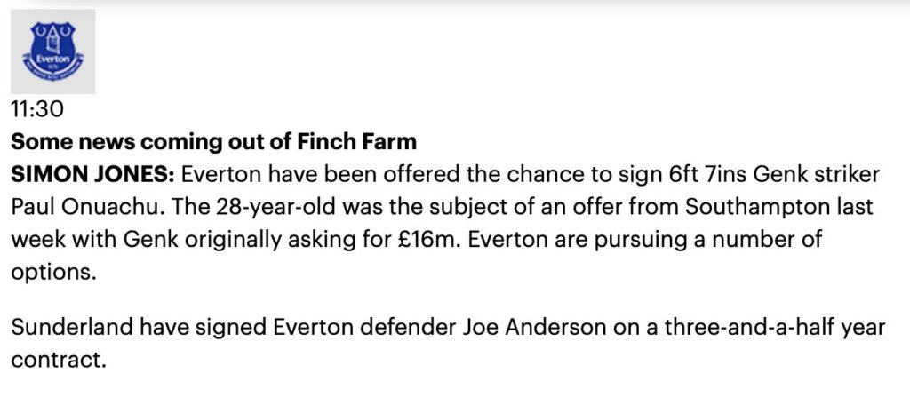 “Some news coming out of Finch Farm: Everton have been offered the chance to sign 6ft 7ins Genk striker Paul Onuachu,” wrote Jones on the Daily Mail transfer blog (Tuesday 31 January, 11:30am).
