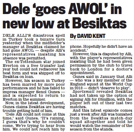 The newspaper reported via their print edition on Thursday (23 March, page 79) that Alli, 26, has been caught up in a “bizarre” drama on loan at Besiktas, where manager Senol Gunes claims the midfielder has gone AWOL.