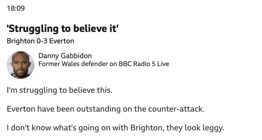 BBC Sport pundit Danny Gabbidon was left astonished by the “outstanding” Everton move that produced their third goal of Monday night (8 May) to remember against Brighton.