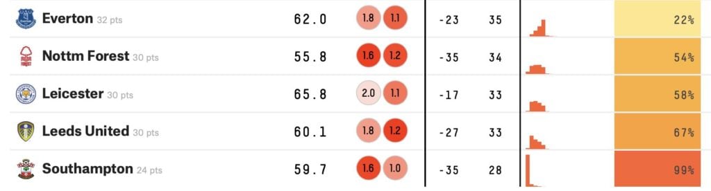 It has predicted that the Toffees will claim three points from their last three games of the season – Manchester City, Wolves and Bournemouth – ending on 35 points and two clear of the relegation zone.
