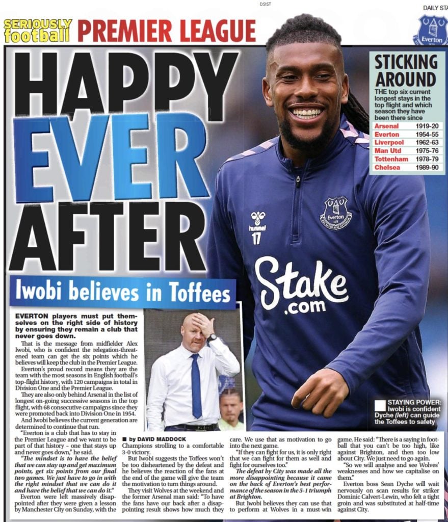 Everton face a nervous wait to determine the outcome of scan results following the injury scare for Dominic Calvert-Lewin in the loss to Manchester City, last Sunday according to an update in the Daily Star [16 May, Page 43].