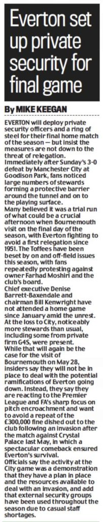 Everton are said to have hired a private security firm as part of preparations for the final home game of the season against Bournemouth on Sunday 28 May, according to a report from Mike Keegan for the Daily Mail [16 May, Page 66].