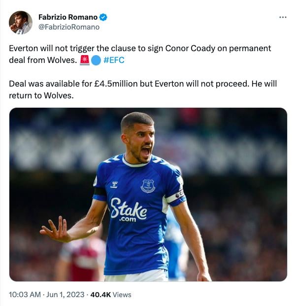 “Everton will not trigger the clause to sign Conor Coady on a permanent deal from Wolves,” he wrote on his personal Twitter account (1 June).