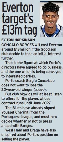 Porto have set a £13million price tag for winger Goncalo Borges amid interest from Everton, according to the Sunday Mirror.
