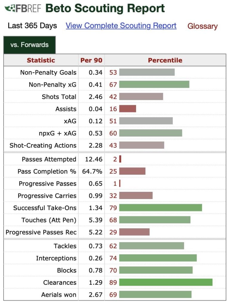 Defensively, Beto does more than is expected of a striker falling in the top 11% of forwards for clearances per game and is an aerial threat both in attack and when near his own goal, but the worries continue about his effectiveness on the ball.