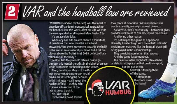 Writing for the Sunday People (31 December, page 56) he said: “Everton boss Sean Dyche was the latest to question the officialdom’s nonsensical approach to the handball law this week, after his side were on the wrong end of a call against Manchester City. It’s an absolute joke.