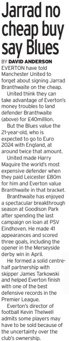 Everton have told Manchester United they won’t be signing Jarrad Branthwaite at a cheap rate, according to the Daily Mirror.