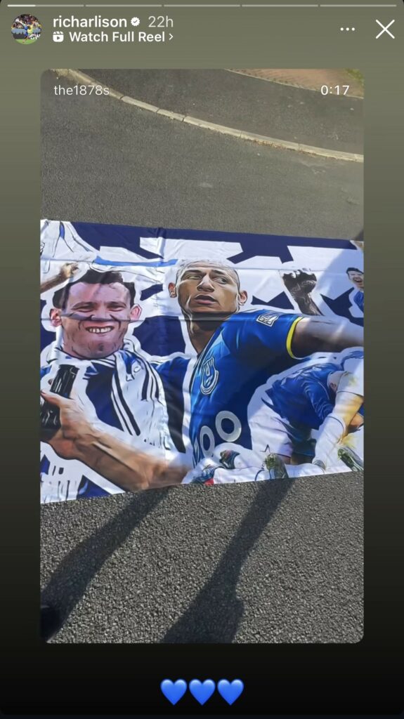 Via his story, Richarlison reposted a video of a flag showcasing the history of Everton, and front and centre of that is the Brazilian, with his post captioned with three blue love heart emojis.