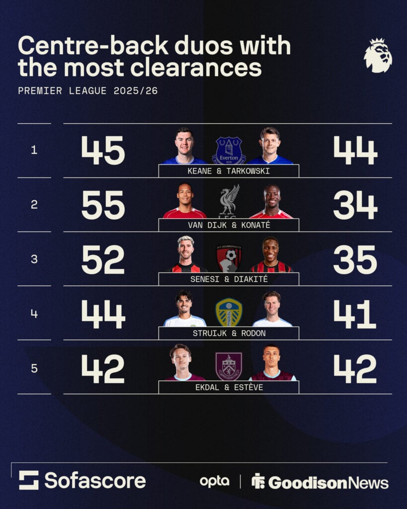 Keane and Tarkowski both rank in the top five central defenders for the most total clearances in the league so far this season.