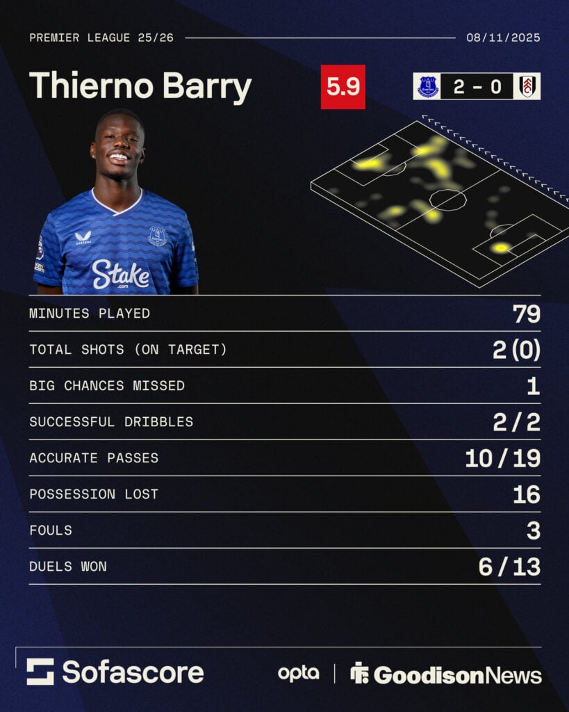 Thierno Barry will feel like the world is against him after failing to score in Everton’s 2-0 win over Fulham on Saturday.