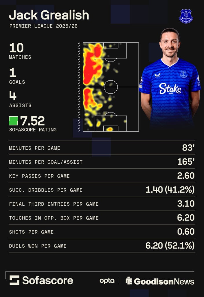 Jack Grealish’s career revival at Everton could reach new heights if he were to score in Everton’s clash with Manchester United on Monday.