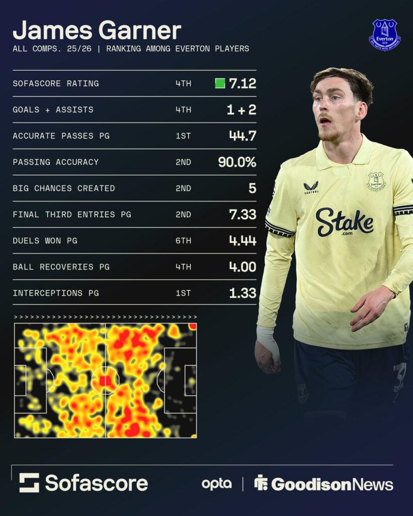 As highlighted by Sofascore, Garner averages a rating of 7.12 in all competitions for the Toffees this season.